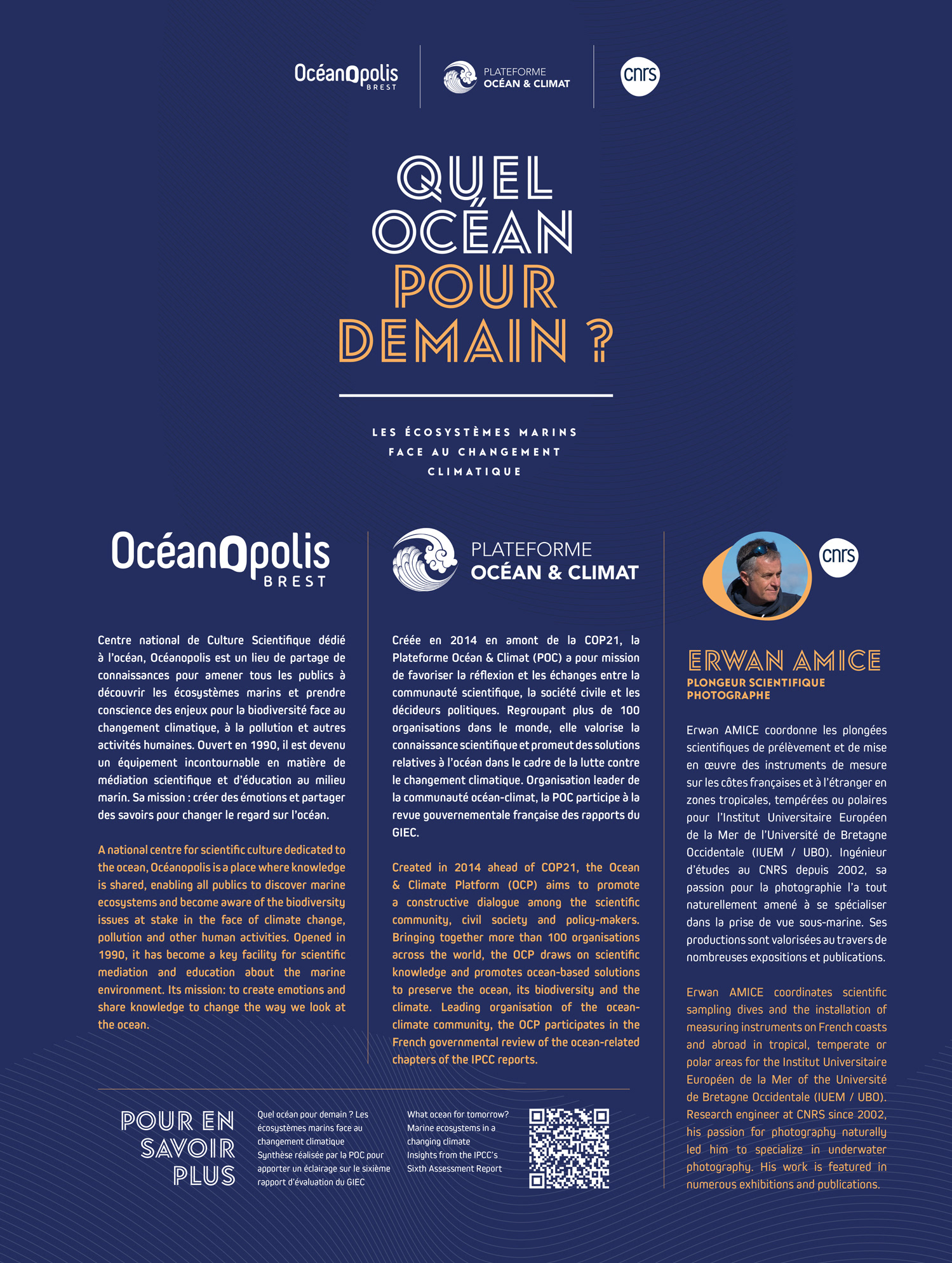 Inspirée des travaux du GIEC, en particulier le 6ème rapport paru en 2023, Océanopolis et la Plateforme Océan & Climat en collaboration avec Erwan Amice, chercheur au CNRS, vous proposent cette exposition illustrant les connexions entre océan, biodiversité et climat.