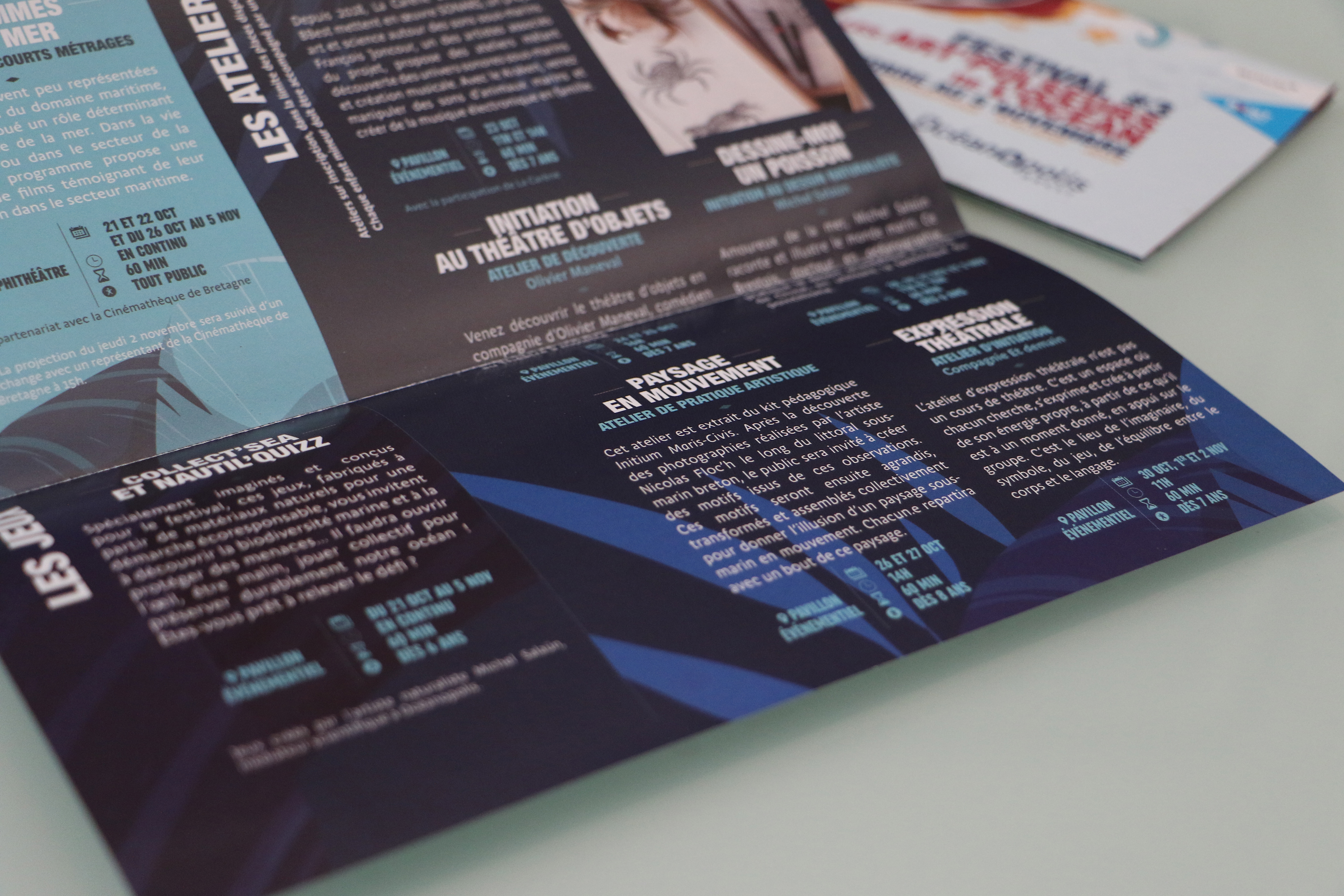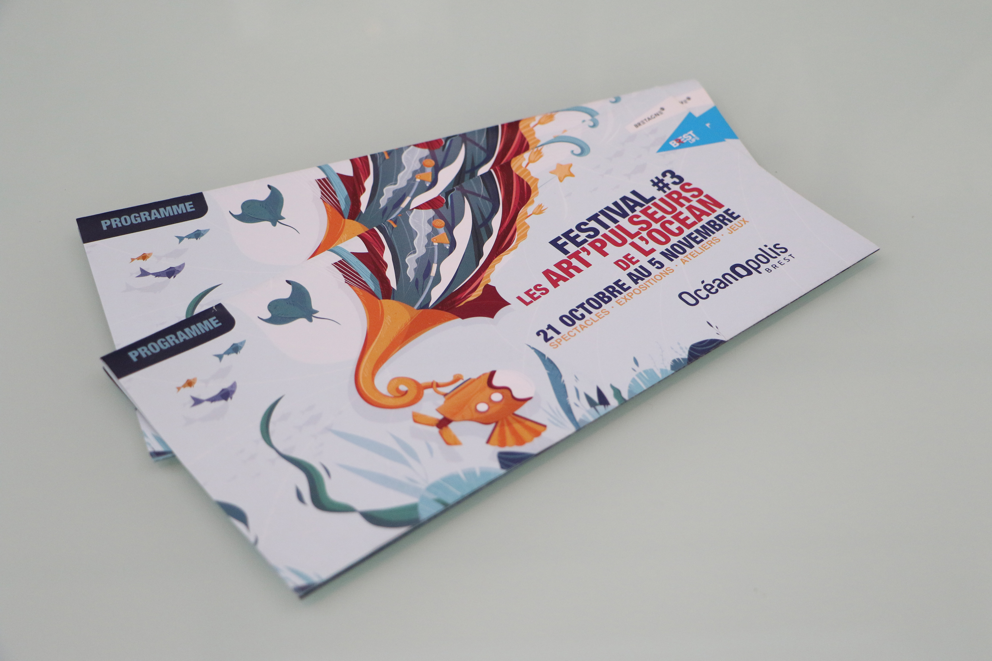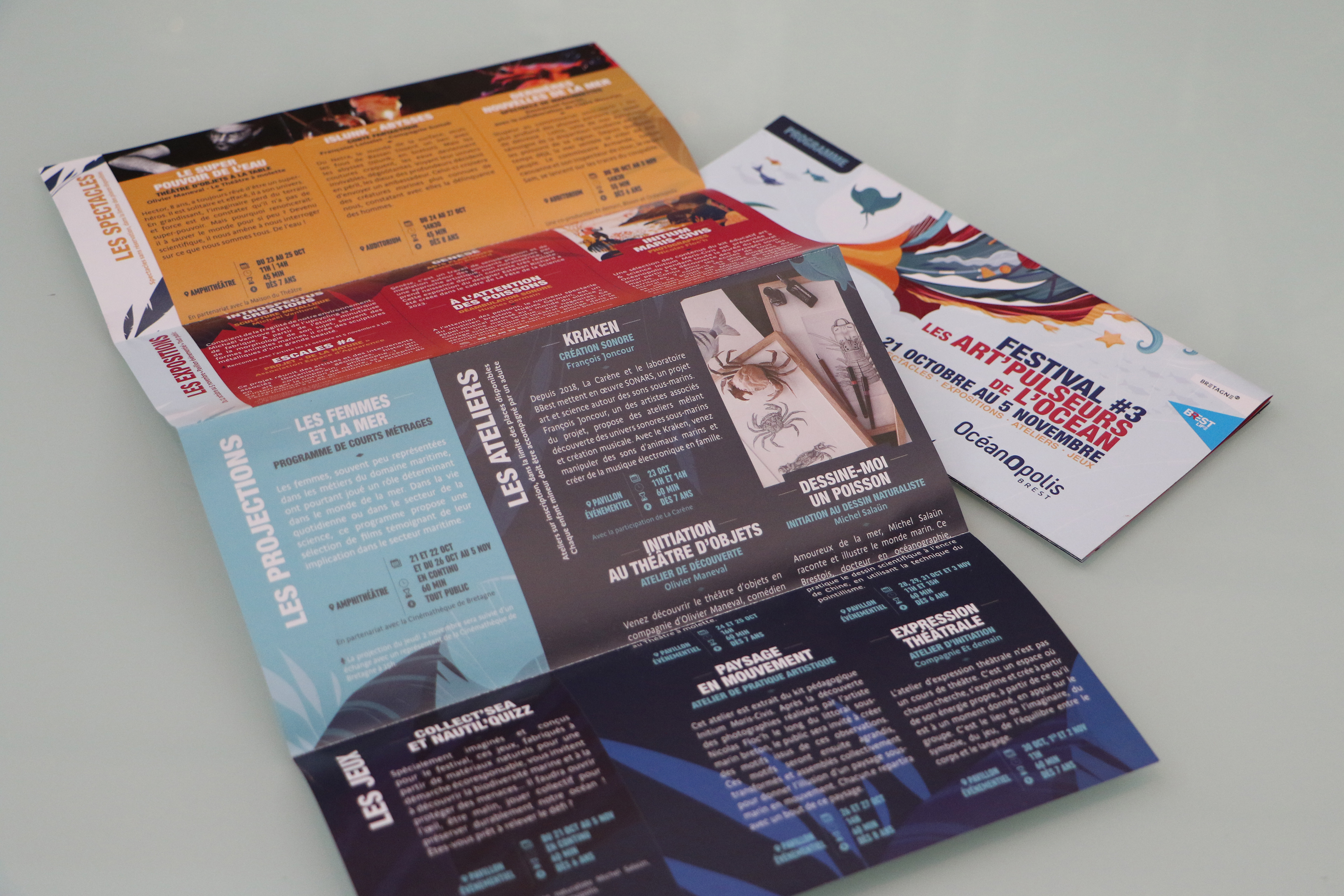 Mise en page de la brochure du festival Les Art’Pulseurs de l’Océan 2023 à Océanopolis Brest.