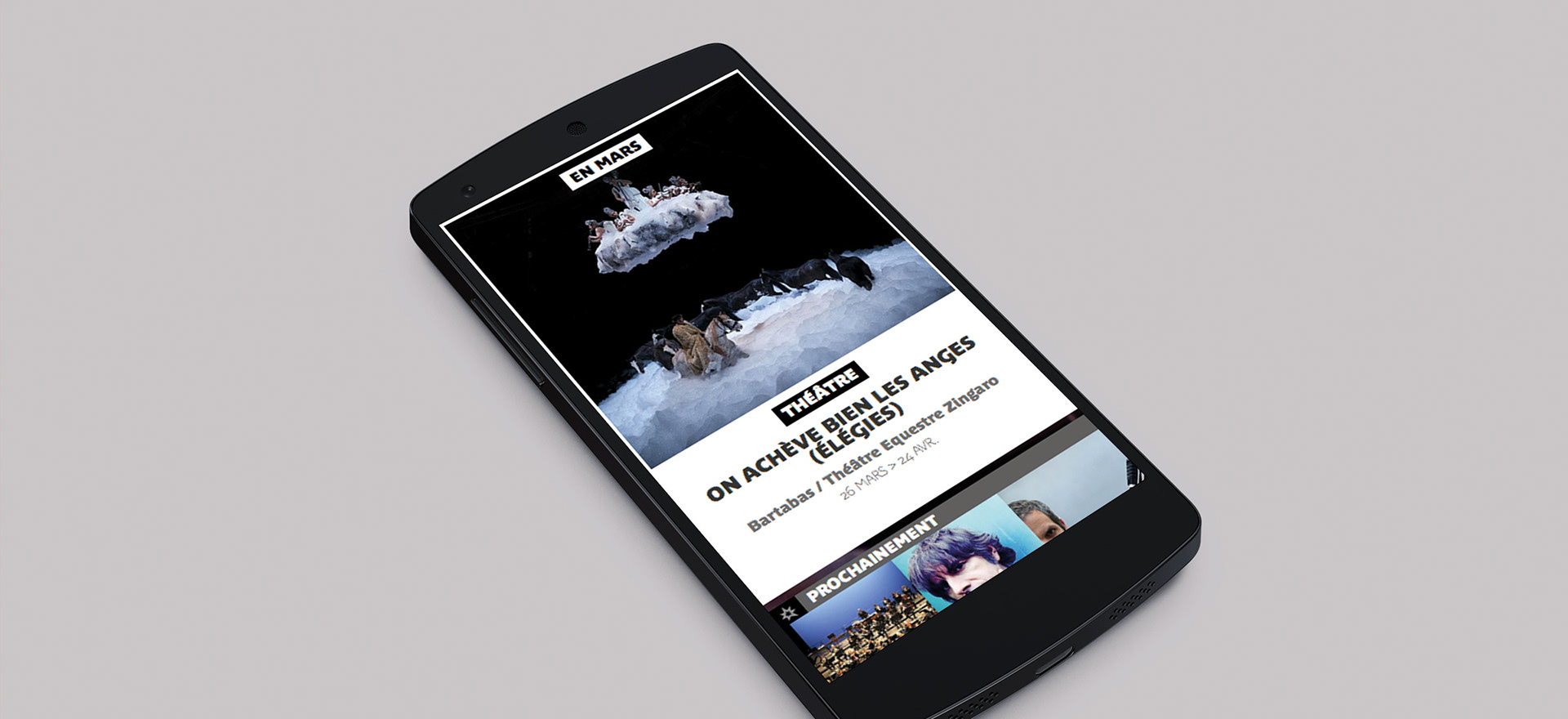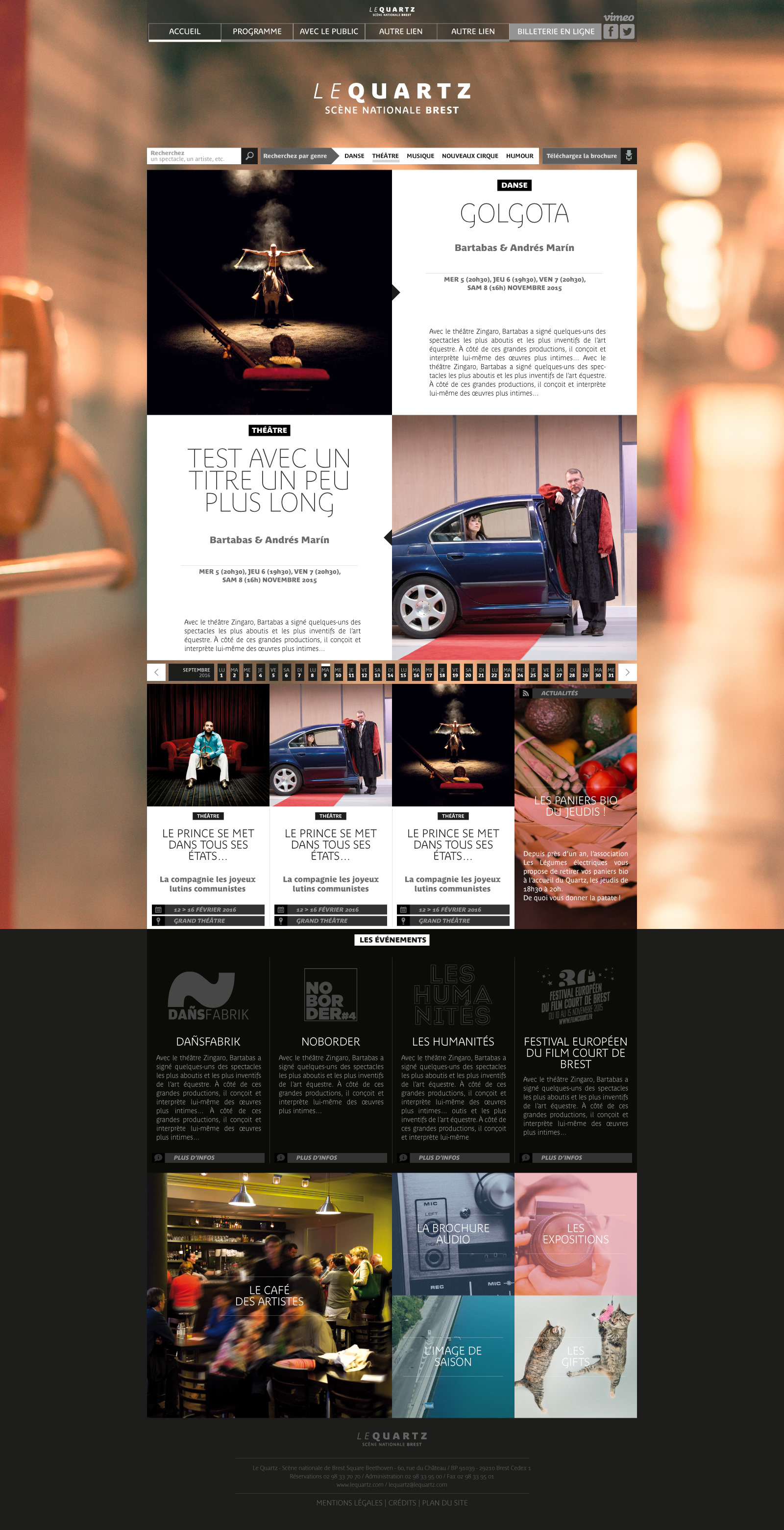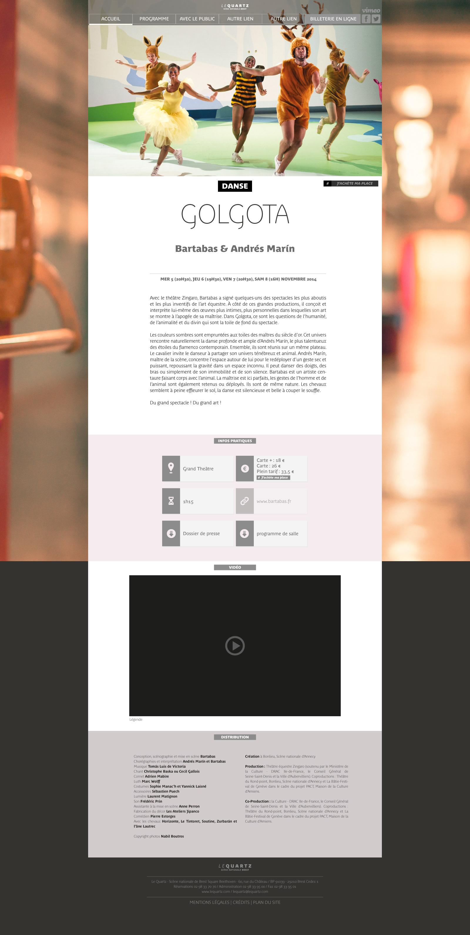Aucune couleur n’est utilisée pour la structure du site. Du gris, du blanc, du noir. Seules les images de spectacles apportent de la couleur. Un graphisme épuré laissant place au contenu.