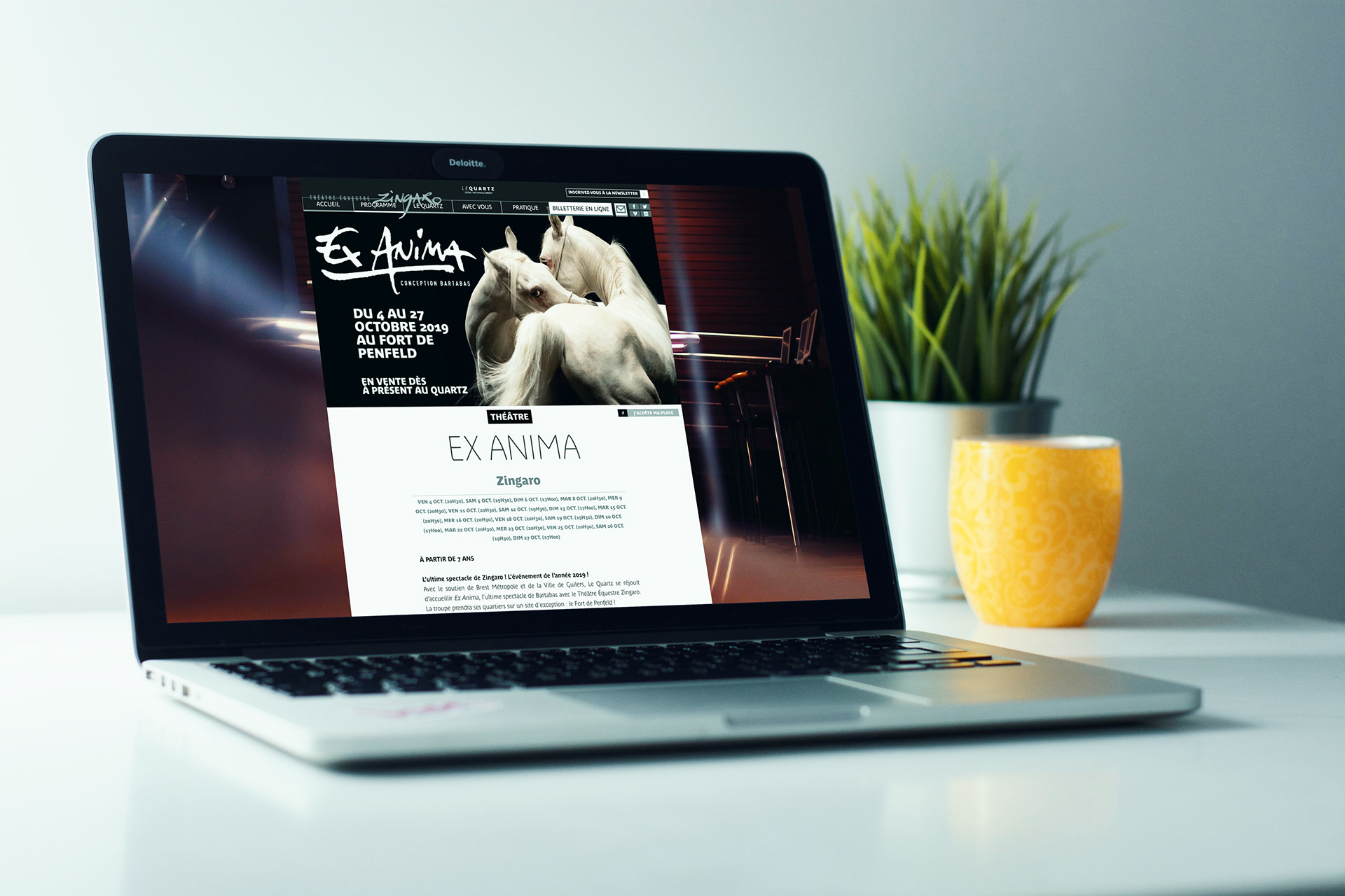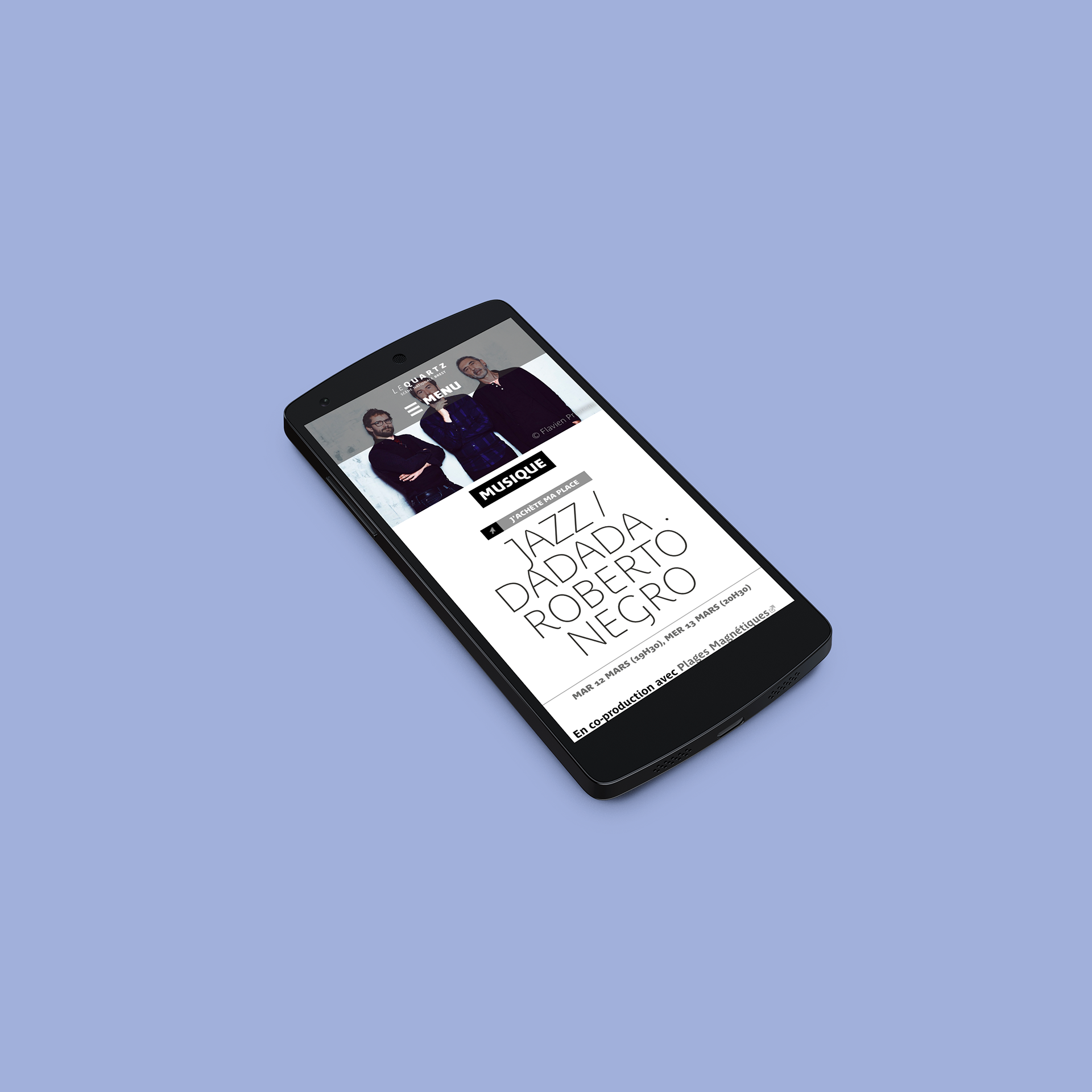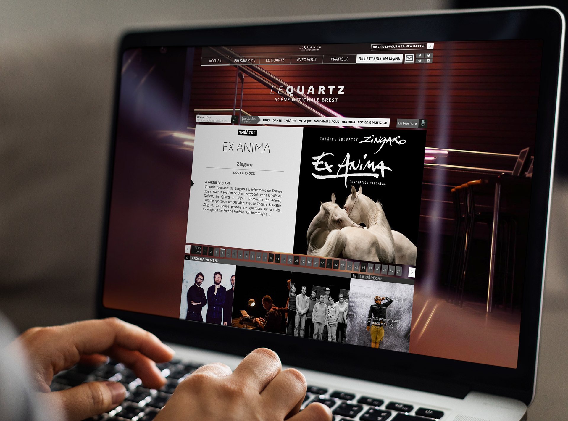 Aucune couleur n’est utilisée pour la structure du site. Du gris, du blanc, du noir. Seules les images de spectacles apportent de la couleur. Un graphisme épuré laissant place au contenu.